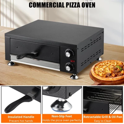 Commercial Pizza Oven Countertop, 3600W Stainless Steel Pizza Maker with TimerKey Features:• Adjustable Power & Dual-Zone Heating: This versatile pizza oven offers three power settings (1100W, 1800W, 3600W) and dual-zone temperature control for both upper and lower heating. This ensures crispy crusts and evenly melted toppings, ideal for various pizza styles. The 60-minute timer with an audible alert provides precise baking control for consistent results.• Commercial-Grade Stainless Steel Build: Constructed with a heavy-duty 304 stainless steel exterior and an aluminized steel interior for maximum durability. The six-sided insulation maintains consistent internal temperatures while keeping the exterior surfaces safe to the touch (under 110°F), making it suitable for busy kitchen environments.• Even Cooking Without Rotation: Full-cavity heating elements provide uniform heat distribution, eliminating the need to rotate pizzas during baking. A built-in oven light allows you to monitor cooking progress without opening the door, which prevents significant heat loss and ensures perfectly baked results.• NSF-Certified & Easy Maintenance: Designed to meet NSF/ANSI 4 commercial standards, this oven features a removable crumb tray and a cool-touch handle for easy cleaning. The non-slip rubber feet provide stability, and the simple wipe-clean surface requires no harsh chemicals for maintenance.• Versatile & Safety Certified: Accommodates 12-inch pizzas, calzones, and flatbreads with ease. UL-listed for safety and compatible with both 120V and 240V power sources, this oven is suitable for both home kitchens and commercial settings like pizzerias and restaurants.Product Details:• Product Type: Commercial Countertop Pizza Oven• Material: 304 Stainless Steel Exterior, Aluminized Steel Interior• Power Settings: 1100W / 1800W / 3600W• Capacity: Fits 12-inch pizzas• Special Features: 60-Minute Timer, Dual-Zone Heating, Built-in Oven Light• Safety Features: Cool-Touch Handle, Non-Slip Feet, Thermal Insulation• Certifications: NSF/ANSI 4 Commercial Standards, UL Listed• Ideal For: Pizzerias, restaurants, home kitchens, catering
