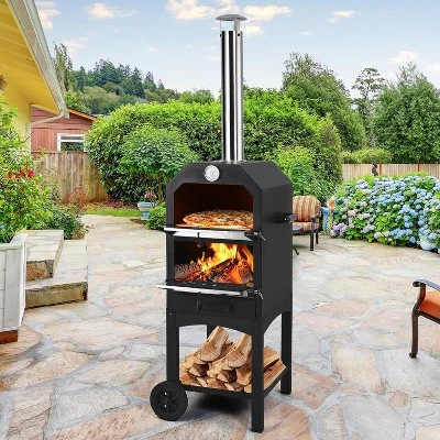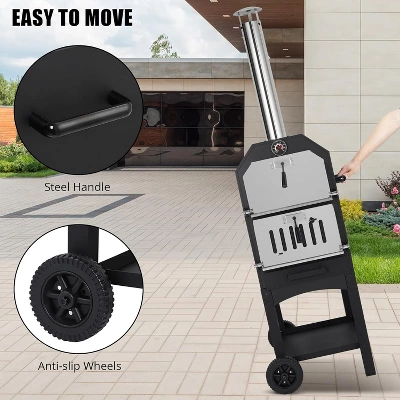 The item type is Outdoor Pizza Oven, Material is Carbon Steel ,Number of Racks is 2 , Fuel Type is Wood, Maximum Temperature is 700°F , Features is Built in Thermometer, Portable, Wheels , Items Included Cover, Pizza Peel, Pizza Stone