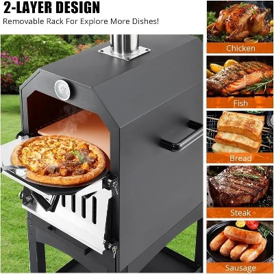- 1. Material: Crafted from high-grade carbon steel with a thick iron-plastic spray powder finish, this outside pizza oven is built to last and guaranteed not to rust for up to 2 years.