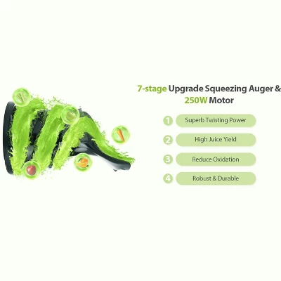 - Powerful 250W Motor – Efficiently separates juice from pulp, delivering pure liquid and ultra-dry pulp waste.