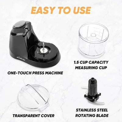 - COMPACT, MINI FOOD PROCESSOR – Aemego’s 1.5 Cup Mini Food Processor packs some power in its small size. This electric food chopper is ideal for small jobs and works quickly. The compact size means you can easily store it within reach for fast access when prepping. H: 5.5 inches X W: 4.7 inches X D: 7.7 inches