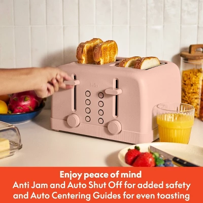 The bella 4-Slice Toaster combines traditional functionality with a sleek, modern design to perk up your kitchen counter. With extra-wide slots that accommodate a variety of bread types, including thick slices and bagels, this toaster is your new go-to. It ensures perfect, even browning thanks to precise 6-setting shade controls and has a Bagel preset for perfect toasting. It also includes a removable crumb tray for easy cleanup, auto centering guides for consistent results, and an anti-jam and auto-shutoff system for added safety.