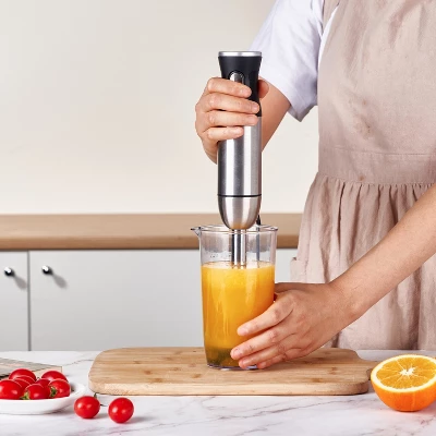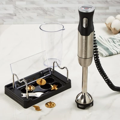 BergHOFF’s X5 Pro Handheld Food processor with 5 interchangeable blades and 4.25″/10oz grinder attachment is a must-have set for every functioning kitchen. This food processor features a powerful 1000W DC motor that reaches 18,000 RPM, it conquers any blending task with ease. Plus, its curly cord can expand up to 13ft, granting unmatched flexibility in the kitchen. The grinder attachment elevates your culinary creations to new heights, ensuring a quick and easy way of chopping ingredients. The combination of the handheld blender and the grinder attachment effortlessly chops onions, garlic, ginger, spices, and much more which is great for making dips or sauces. Whether you’re preparing sauces, dips, or meal prep, this complete set is a must-have for any cooking enthusiast. Set includes: hand blender, inching switch, milk frother, meat mincer, beater, whisk, multi-purpose blade, blade remover, mixing cup, storage case, grinder attachment with lid, and grinder blade
