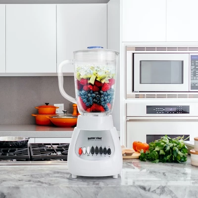 Create an assortment of desserts, drinks, and sauces with the Better Chef 10-Speed 350 Watt Glass Jar Blender. The versatile 10 speed motor functions with an assortment of ingredients; be it berries or hard chocolate. And why stop there, take full advantage of 350 watts of power to crush ice into the perfect smoothie. All well within a generous 42 ounce glass jar. Blend together classic milkshakes, tropical drinks, or potent protein shakes! Wipe-able easy to clean ABS polymer housing and a dishwasher safe glass jar. Removable filler cap allows you to add ingredients while blending.