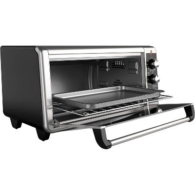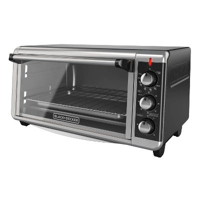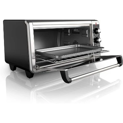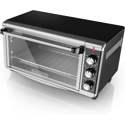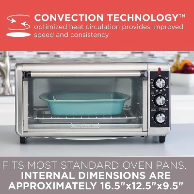 The BLACK+DECKER 8-Slice Extra-Wide Stainless Steel/Black Convection Countertop Toaster and Pizza Oven with Broiler Pan simplifies large baking tasks. Its extended interior fits an entire 13”x9” pan with handles, so you can bake lasagna, brownies, and even 12” pizzas with your standard bakeware. You won’t have to wait around for your large oven to preheat anymore, just set the correct temperature and time and you’ll be baking in minutes with four unique functions: bake, broil, toast, and keep warm. Convection technology circulates air within the oven for fast and even results while baking. Plus, the toaster oven includes a broiler pan and an external crumb tray that slides in and out, making cleanup a breeze. When it’s time to eat, trust the #1 brand in toaster ovens*—BLACK+DECKER.