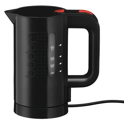The Bodum BISTRO electric water kettle is designed to rapidly boil with energy-saving efficiency and is ideal for heating water for coffee, tea, instant soups, and more. The easy to read water level indicator prevents waste of water and energy. The electric water kettle has a steam sensor for automatic shut-off and added safety.