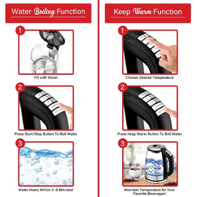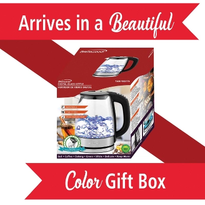 Boil water in minutes with the Brentwood KT-1982DBK 1.79-Qt. Cordless Digital Glass Electric Kettle with 6 Precise Temperature Presets. Brew the ideal cup of coffee, boil water faster than a microwave, and masterfully steep all kinds of tea thanks to the 6 smart temperature presets. It’s also safer than a stove top kettle. This cordless kettle lifts off the base for easy filling and pouring. Full glass kettle, stainless steel heating element, and BPA-free parts keep the water free of impurities. Auto shut off, boil dry and overheat protection for added safety. The unit automatically shuts off once water reaches desired temperature.