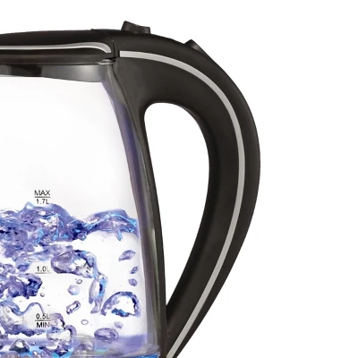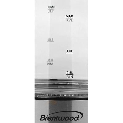 Boil water in minutes with the Brentwood 1.7L Cordless Glass Electric Kettle. Cordless kettle lifts off the base for easy filling and pouring. Full glass kettle, concealed heating element and BPA Free. Auto shut off, boil dry and overheat protection for added safety.