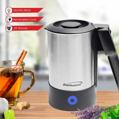 The Brentwood 20 Ounce Dual Voltage 110-240v Stainless Steel Electric Travel Kettle can be used worldwide thanks to 110 to 240 voltage rating. Boil water faster than a microwave and safer than a stove top kettle. Conveniently make hot tea, French press or pour over coffee, instant oatmeal and more. Our perfect travel kettle has a slim folding handle and a power cord that winds up into the base, keeping your luggage compact and tidy. Full stainless steel interior, concealed heating element and BPA Free parts ensure water is free of impurities. Includes boil dry and overheat protection for added safety. Unit automatically shuts off once water reaches a boil.