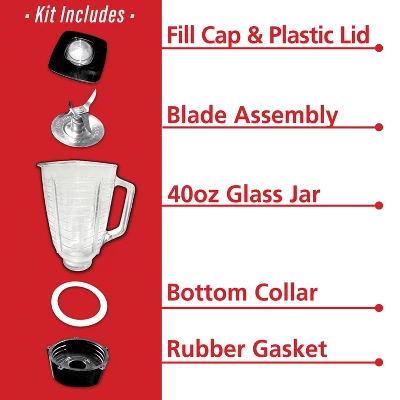 The Brentwood 42 Oz. Replacement Glass Jar 6-Piece Set for Oster Blender P-OST722 will get you back up and blending in no time. This set includes a fill cap, plastic lid, bottom base, rubber gasket, and food-grade stainless steel blades. Save money and continue using your favorite Oster countertop blender with the complete replacement blender parts set.