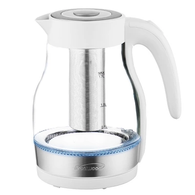 The Brentwood 1.7L Cordless Glass Electric Kettle with Tea Infuser, Black boils water faster than a microwave and safer than a stove top kettle. Water boils within minutes with a single push of a button. Gorgeous blue LED lights up the glass kettle while boiling. Cordless kettle lifts off the 360 swivel base for easy filling and pouring. Conveniently make hot tea, French press or pour over coffee, instant oatmeal and more. Full glass kettle with food grade stainless steel tea infuser, concealed heating element and BPA Free parts keeps water free of impurities. Includes boil dry and overheat protection for added safety. Unit automatically shuts off once water reaches a boil.