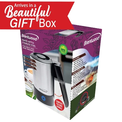 The Brentwood KT-1506S 20 Oz. Dual Voltage Stainless Steel Electric Travel Kettle can be used worldwide thanks to its 110 to 240 voltage rating. Boil water faster than a microwave and safer than a stove top kettle. Conveniently make hot tea, French press, or pour-over coffee, instant oatmeal, and more. The travel kettle has a slim folding handle and a power cord that winds up into the base, keeping your luggage compact and tidy. Its full stainless steel interior, concealed heating element, and BPA-free parts ensure water is free of impurities. It includes boil dry and overheat protection for added safety. The unit automatically shuts off once water reaches a boil.