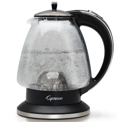 The iconic Capresso H2O Glass water kettle is constructed of German-made Schott – DURAN® heat resistant glass. This glass kettle features ounce and cup markings for easy filling. A patented stainless steel dome covers the highly efficient concealed heating element. The H2O Glass boils water fast, quietly and safely then shuts off automatically. In addition to boiling water for tea, the H2O Glass is handy for heating water for French press or pour-over coffee. This beautiful kettle can be removed from the base and brought to the table for serving. A thermal cut-off and dry boil protection add safety to this model. You can even heat water for instant soup, oatmeal or other hot beverages. The H2O Glass water kettle is a modern design for your home.