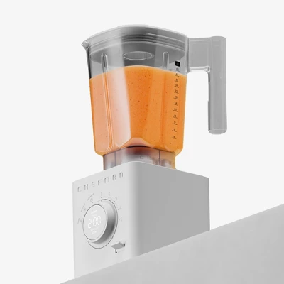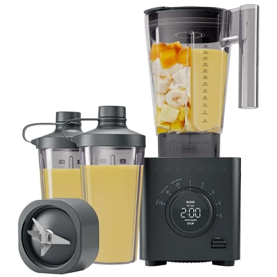 Obliterate any- and everything with the Chefman Obliterator™, a high-powered small blender that makes crushing ice look easy! With a robust 1380W motor and advanced airflow system, you can pulverize even the toughest ingredients while the blender remains cool and quiet. The new Auto Blend function identifies ingredients, automatically optimizing the blending cycle for the best results possible. The dial controls are easy to use, allowing you to choose from six blending speeds and three preset functions. The 48 oz. blending jar pours perfectly, and the stainless-steel blades hold up well to wear and tear. The kitchen blender comes in a beautiful matte finish and includes two separate 20 oz. travel jars and sipping lids, a dedicated blade assembly, a tamper/scraper tool, and our chef-crafted digital cookbook. Whether you’re whipping up smoothies, soups, or sauces, the Obliterator™ delivers unparalleled results with every blend. Purchase includes a 5-year assurance from Chefman. 1380W/120V