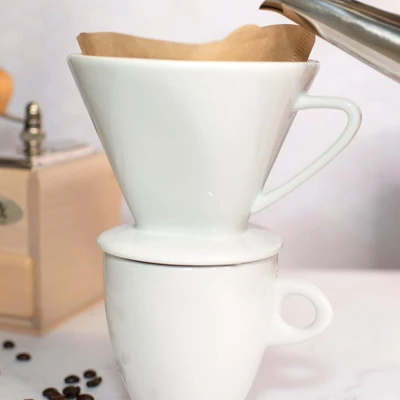Porcelain Filter HolderBrewing coffee manually improves its flavor, it’s not just nostalgic. Or maybe you don’t want to turn on your 12-cup coffeemaker when all you want is one or two cups. Or maybe you just enjoy the ritual of brewing by hand? Ideal for quantities large or small. Made of fire-proof hard porcelain. How to brew: Rinse the filter holder with hot water. Set atop of coffee pot, insulated server, or mug. Place a permanent paper filter inside the holder. Add ground coffee (medium to fine-grind). Per cup (5fl. oz. / 150 ml) use 0.3 oz. / 8 g freshly ground coffee. In a separate vessel pre-measure water and heat to approximately 200F (just below a full boil). Starting in the center, pour a small amount of water in a circular motion over the ground coffee until the surface is wet. Wait for a half minute to let the coffee “bloom”, then slowly add the remaining hot water. Total brew time should be between 2.5 to 3 minutes.