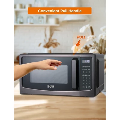 Heat and re-heat your favorite foods and beverages with this outstanding Commercial Chef microwave oven countertop. Our 1100 watt microwave oven with turntable has an impressive capacity of 1.1 cubic feet and ensures you can grab and go with delicious meals. The appealing and timeless decor of this black stainless steel front microwave in black housing (21″ x 11.12″ x 16.56″) will fit easily on your kitchen counter or microwave shelf in your home, apartment, RV, dorm room, and more. Weighing only 28 lbs., you can transport this 1000 watt microwave anywhere so heated food and drink is within reach. Our portable microwave has 10 power levels, 6 pre-set Quick Cook menu options, defrost by time and weight, and more. 6 quick cook menu options include potato, popcorn, pizza, beverage, frozen dinner and reheat. Our microwave oven also features 2-step child safety lock system for added safety. With an LED digital control panel for all settings and clock with timer, our microwave 1.1 cu ft countertop will heat from 30 seconds to 99 minutes! Additional features include a convenient pull handle door, 1000 watts of power, cooking end signal, and an efficient 12.4 diameter turntable that guarantees even heating. What’s not to love about this COMMERCIAL CHEF microwave countertop Its reliable heating ability, impressive functions & settings will have you heating and re-heating throughout your busy day!