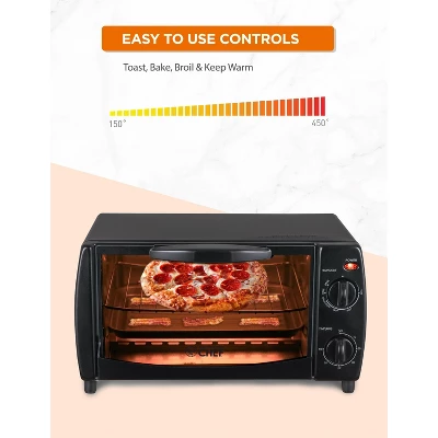 Our COMMERCIAL CHEF toaster oven is perfect for your kitchen countertop to make delicious meals. Our toaster/oven (14.57″ x 11.42″ x 7.95″) has a 10L capacity that will hold 4 slices of bread and a 9″ pizza. This pizza maker has top and bottom heaters, galvanized cavity, and mechanical controls to easily set your temperature and bake time. With a top tube heating capability of 550W and bottom tube heating capability of 450W, your meals will be cooked thoroughly. This 4 toaster slice toaster (6.15 lbs.) has 4 functions: Toast, Bake, Broil, & Keep Warm. Also included is a baking pan, wire rack, and crumb tray for easy cleanup. 120V/60Hz/1000W. Our toaster oven broil includes a cooking end signal so you can retrieve your bread, pizza, or other meals right on time. Thanks to this pizza toaster oven, you can save time in the kitchen with a convenient and streamlined new appliance. Heat up meals and enjoy amazing recipes. This COMMERCIAL CHEF toaster oven is the perfect necessity for your kitchen countertop.