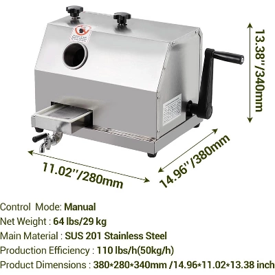 The item type is Squeezer Juicer , Material is Stainless Steel , Power Source is Manual , Appliance Uses is Juice , Capacity is 110LBS/H , Components Included Blades, Container, Handle , Features is Easy Clean, Manual , Package Include: 1x Manual Sugar Cane Juicer Machine