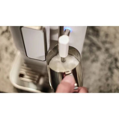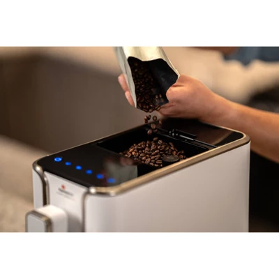 THIN, FAST & EASY ESPRESSIONE Concierge Elite fully automatic Bean to Cup espresso machine will brew barista-quality espresso drinks effortlessly with a simple touch of a button. Exceptionally compact THIN profile – with a width of only 7 inches (180 mm) the machine allows you to place it in your home office, kitchen or any convenient place. Astonishingly FAST thermoblock heating system-first drop of coffee appears approximately 22 seconds from standby position. High-performance 20-bar pump provides balanced extraction. Stainless-steel conical grinder has adjustable settings. 400-gram coffee bean hopper has airtight seal that keeps beans fresh. Incredibly EASY to use LED Control Panel with elegant Cobalt Blue display icons. One touch keys for your favorite coffees : Espresso, Lungo and Ristretto. Adjustable coffee spout fits variety of cup sizes. Steam Nozzle for Frothing Milk is adjustable to create the perfect cappuccino or macchiato. Express Yourself by enjoying your favorite espresso beverage in a beautifully smart and solid performing fully automatic espresso machine, without the need for SmartHQ or other apps in two amazing options, Concierge Elite Infinite Black or Concierge Elite Diamond White!