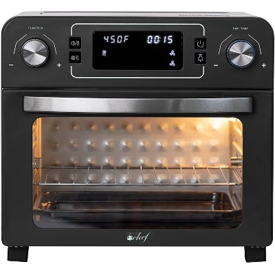 Make healthier meals as you toast, roast, bake, and grill using up to 80% less fat and oil than traditional frying. Using advanced cooking effects of rapid hot air circulation, air frying cooks foods on all sides fast and evenly, allowing you to create not only healthier meals, but incredibly delicious foods as well.Simply press and select one of 10 pre-set cooking modes to start cooking. Use these settings for fantastic French Fries, Pizza, Bread, Cake, Chicken, Steak, Rotisserie, Fish, Dehydration, and Keep Warm. The oven’s digital interface and dial combo make setting your air frying oven quick and painless.Have your own recipe? This oven air fryer has custom cooking settings, allowing you to manually adjust time from 1-60 minutes and temperatures of up to 450F. Built with beautiful and tough stainless steel, this Toaster Air Fryer combo oven will fit in with any kitchen and last!Each oven unit comes with built-in internal lighting so you can check your cooking progress while looking through the front viewing window.Additionally, each toaster air fryer oven comes with a Baking Tray, Oven Rack, Air Fryer Basket, and Rotisserie Forks. Cleanup is no problem as each piece is removable and dishwasher safe!FeaturesCook fast and delicious meals with the power of air fryingAir frying technology that heats food on all sides simultaneously for fast and evenly cooked resultsUp to 24 Quarts of Oven Capacity with 3 Different Rack PositionsIncludes 10 Cooking Programs: French Fries, Pizza, Bread, Cake, Chicken, Steak, Rotisserie, Fish, Dehydration, and Keep WarmSelect your preferred fan speed to adjust how your food is cookedQuality Stainless Steel constructionWatch cooking progress with oven glass panel and interior lightIntuitive Controls – Easy to use Time and Temperature Adjustment Dials with Digital LED Display SpecificationsPower: 120V 60Hz, 1700 WattsMaterials: Stainless Steel Housing with Oven Glass DoorOven Capacity: 24 QTInterface: Adjustment Knobs, Touch Controls, Digital Control PanelDimensions: 16″ x 12″ x 14.5″Inner dimensions: 13″ x 12.36″ x 8.75″ Included AccessoriesBaking TrayOven RackAir Fryer BasketRotisserie Forks