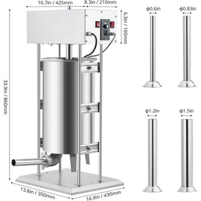 The item type is Vertical , Material Barrel & Tubes is SUS304 (food grade) ,Capacity is 25L , Power Type is Electric , Tube Dimensions is φ1.5 in, φ1.2 in, φ0.83 in, φ0.6 in , Power is 200W , Sealing Ring is Silicone (food grade) , Pressure Plate is Aluminum (food grade) , Voltage is AC110-120V/60Hz , Package Include: 1x Electric Sausage Stuffer Maker