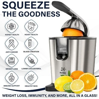 Say Goodbye to Wimpy Juicers and Hello to Real PowerLook, you don’t buy a citrus juicer just to squeeze a little juice—you want every last drop. You want it fast, fresh, and you don’t want to fight your machine or wrestle with cleaning. That’s why the Eurolux 300W Citrus Juicer is built like a tank and purrs like a kitten.Let’s Get Real: Most Juicers Are Weak.They stall, they squeak, they make a mess. Not this one. With 300 watts of raw muscle under the hood, you’ll tear through lemons, oranges, limes—heck, even stubborn grapefruit—with the kind of speed and efficiency that’ll make you wonder how you ever lived without it.Juicing Shouldn’t Be a Chore—It Should Be a Joy.That’s why Eurolux designed this thing for pure, hassle-free operation. Forget about “learning curves” or reading a tiny manual. Just press down, and it goes to work. Want it smooth? Want a little pulp? You control it, right there.Cleaning? Two Words: Dishwasher Safe.When you’re done, pop off the parts and let your dishwasher handle the dirty work. No sticky hands, no scrubbing, just more time for you.Looks That Demand Countertop Space.Who says kitchen appliances should be ugly? The brushed stainless steel finish isn’t just about style—it means real durability. This is a statement piece that actually belongs out in the open, not hidden under your sink.Juice, Don’t Wake the House.The motor is powerful, but runs whisper-quiet, so you can get your morning glass while everyone else sleeps in. No drama, no complaints, just pure, fresh juice.Smart and Safe—So You Can Juice With Confidence.Overheat protection is built in. Push it to the limit on those busy weekends, and it’ll keep its cool. That’s the kind of peace of mind you want.Here’s What You Get:True 300W heavy-duty motor for real performanceDishwasher safe, for fast, no-fuss cleanupSnap-up spout—no drips, no sticky puddlesBrushed stainless steel—tough and handsomePulp control—because everyone likes it their wayQuiet motor—juice in peace, any timeOverheat protection for safetyCorded electric power—always ready when you areBottom Line:This isn’t just a juicer. It’s a power tool for your kitchen. Fast, quiet, easy to clean, and tough as nails—everything you wish your old juicer could be. Stop settling for watery juice and slow machines. Upgrade to the Eurolux 300W Citrus Juicer and turn every day into a fresh-squeezed victory.Don’t just juice—dominate. Your kitchen, your way. Bring home the Eurolux and squeeze the day.