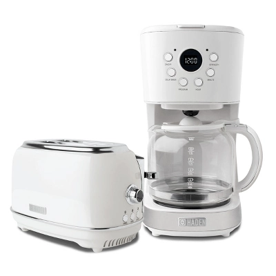 Never leave the house without the right amount of caffeine with the Haden 12 Cup Programmable Coffee Machine and 2 Slice Wide Stainless Steel Bread Toaster. With 6 unique functions and a vintage look, this coffee maker allows anyone to take control of their cup of coffee while adding style to any kitchen. The sleek front-facing button design with LCD display allows for simple use of the program, hour, minute, strength, and delay-brew functions. Each function is there to help your day go smoothly. The beautiful toaster features convenient cancel/defrost/reheat settings, self-centering function, and a removable crumb tray for easy cleaning. The variable browning knob gives you control over the toastiness of your bread, letting you choose from light browning, dark browning, or the golden browns in between. Built with extra-wide slots, this toaster does more than make crunchy toast. Cook thick slices of bread or your favorite bagel exactly how you like it by adjusting the variable browning control knob on this cutting-edge machine. Start your day off right with the Haden Heritage 2-Slice Wide-Slot Stainless Steel Toaster and 2 Slice Wide Stainless Steel Bread Toaster.