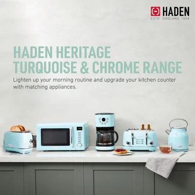 Upgrade your morning with the Haden Coffee Machine and Heritage 4-Slice Wide Slot Toaster. The sleek, durable housing is a hallmark of modern kitchen convenience and their simple beauty is a perfect addition to any countertop. Featuring a 12-cup capacity, the coffee maker is great for coffee lovers and enthusiasts. It nestles beautifully in small spaces and fits perfectly on your kitchen counter. The easy-to-use design includes a programmable clock and functions like Brew Strength for just the right type of brew to start your day, and a Delay Brew setting for coffee-making convenience on your schedule. Rely on the Auto Shut-Off feature that powers the unit off after 120 minutes (about 2 hours) for peace of mind on busy mornings. With 4 extra-wide slots, the electric toaster fits a wide range of bread, from standard-sized to thick artisanal slices. The 4 slot toaster’s self-centering function helps keep your bread and bagels perfectly positioned for even toasting, while the adjustable browning control empowers you to tailor the toastiness to your liking. The cancel, defrost, and bagel features of the bagel toaster adapt to your needs for added convenience. Cleanup is easy with the removable crumb trays that trap any residue, maintaining the toaster’s fresh and clean appearance and functionality. Inspired by British homes, architecture, and landscapes, this Haden electric coffee maker and Heritage toaster feature a stand-out Turquoise & Chrome color scheme.The Haden Coffee maker and Heritage toaster embody the fusion of innovation and modern functionality. Add these appliances to your kitchen necessities and take your morning to the next level.