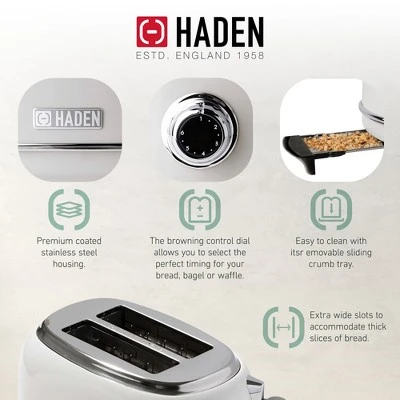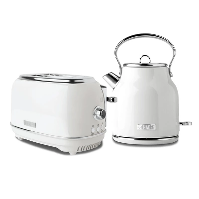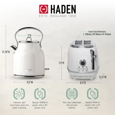 Kitchen appliances are all about convenience and versatility, and you’ll get just that with the Haden Heritage 1.7 Liter Stainless Steel Electric Kettle and 2 Slice Toaster.Designed with a sleek and sturdy stainless steel housing, this tea kettle is perfect for everything from boiling water for tea to craft coffee makers. Thanks to the 1.7-liter body, you heat up or boil up to 1.7 liters of water at a time. It’s designed with a 360-degree base too, which ensures it will be sturdy and not tip over and spill hot water. Utilize the indicator light to know when the water is fully boiled.The beautiful toaster features convenient cancel/defrost/reheat settings, self-centering function, and a removable crumb tray for easy cleaning. The variable browning knob gives you control over the toastiness of your bread, letting you choose from light browning, dark browning, or the golden browns in between. Built with extra-wide slots, this toaster does more than make crunchy toast. Upgrade your kitchen with the Haden Heritage 1.7 Liter Stainless Steel Electric Kettle and 2 Slice Toaster.