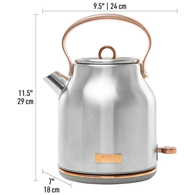 Upgrade your morning with the Haden Heritage 2-Slice Wide Slot Toaster and Electric Kettle. The sleek, durable housing is a hallmark of modern kitchen convenience and their simple beauty is a perfect addition to any countertop. Featuring 2 extra-wide slots, the electric toaster fits a wide range of bread, from standard-sized to thick artisanal slices. The 2 slot toaster’s self-centering function helps keep your bread and bagels perfectly positioned for even toasting, while the adjustable browning control empowers you to tailor the toastiness to your liking. The cancel, defrost, and bagel features of the bagel toaster adapt to your needs for added convenience. Cleanup is easy with the removable crumb tray that traps any residue, maintaining the toaster’s fresh and clean appearance and functionality. This water boiler is perfect for everything from boiling water for tea to craft coffee makers. Thanks to the 1.7-liter body, equivalent to 7 cups, you can heat up or boil up to 1.7 liters of water at a time. The electric kettle for boiling water is designed with a 360-degree base, too, which ensures it will not tip over and spill hot water. Utilize the indicator light to know when the water in the electric pot is fully boiled. Additionally, the boil-dry cut-off protection adds an extra layer of safety to keep the stainless steel kettle from operating without water. If you forget to turn the tea kettle off, the auto shut-off feature will take care of that for you. Inspired by British homes, architecture, and landscapes, this HADEN Heritage toaster and kettle feature a chic Steel & Copper color scheme.The HADEN Toaster and Kettle embody the fusion of innovation and modern functionality. Add these appliances to your kitchen necessities and take your morning to the next level.