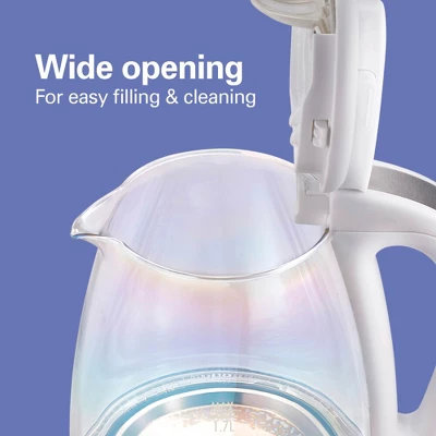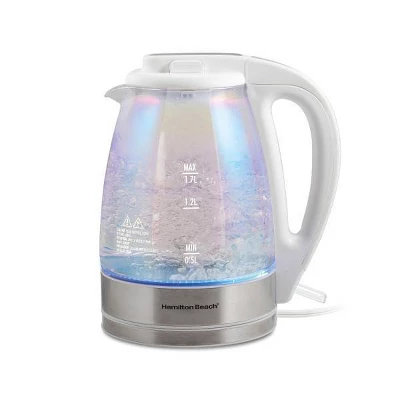 The Hamilton Beach® Iridescent Glass Kettle has 1500 watts to heat up to 1.7 liters of water faster than a microwave and safer than a stovetop. You’ll love the convenience of making a quick, hot cup of tea, French press coffee or hot cocoa without the wait. Perfect for hectic mornings or anytime you’re in a hurry and need boiling water fast. Make ramen, instant oatmeal, grits and easily add boiling water to the pot when making pasta, soups, stews and other recipes. The kettle has a BPA-free borosilicate glass interior for confident, worry-free use. The electric kettle automatically turns off when it reaches a boil, and boil-dry protection prevents scorching if water gets low. The kettle’s glass has a beautiful iridescent quality, and the blue LED lights cast a soft blue glow when the kettle is on and heating. The electric kettle is easy to use with a simple on/off switch and includes a built-in mesh filter that prevents mineral scale from getting in your cup. The cordless kettle conveniently lifts off the base to serve hot water at the table. A wide mouth makes filling and cleaning easy. Convenient, built-in cord storage area under the base reduces countertop clutter.