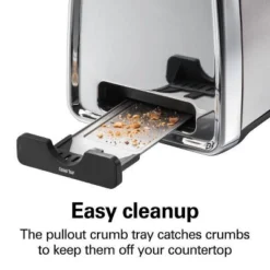 The Hamilton Beach® Classic Stainless Steel 4 Slice Toaster does everything you’d expect a toaster to do, plus a lot more. The Sure-Toast™ One Slice feature is designed to evenly toast on both sides of a single slice. Just press the One Slice button. With Sure-Toast™, bread, waffles, English muffins, and sandwiches made from toasted breads will look as good as they taste. Whether you toast 1, 2, 3 or 4 slices, you always get balanced toast color and texture. Toasting smaller breads is no problem either. Auto Boost automatically lifts small breads like English muffins and gluten-free bread slices higher so they’re easier to retrieve from the toaster. The bagel function perfectly toasts bagels — it toasts the cut side and gently warms the outside so your bagels are toasty on one side and soft on the other. The defrost setting ensures optimal cook time and great performance when toasting frozen breads and waffles. Wide toasting slots easily accommodate thicker breads like Texas toast and bagels. Stop the toast cycle at any time by simply pressing the Cancel button. The large pullout crumb tray is easy to access and clean, but out of sight. Choose from 9 toast shades.