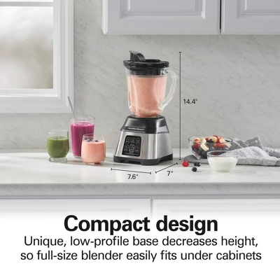 - SLEEK, COMPACT DESIGN: The unique, low-profile base decreases height, so this blender for shakes and smoothies easily fits under cabinets and the controls are easy to reach.