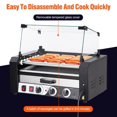 High-Capacity Hot Dog Roller Grill with Dual Temperature Control ¨C 7 Roller Stainless Steel Design, Removable Glass Hood & Bun WarmerKey Features:Simultaneously Cooks 18 Hot DogsEquipped with 7 non-stick rollers, this commercial-grade hot dog machine efficiently prepares up to 18 hot dogs at once. Ideal for home gatherings, parties, food stands, or high-volume environments, ensuring quick and consistent results.Dual-Zone Precision Temperature ControlTwo independent temperature knobs allow separate adjustment for front and rear rollers. Cook and keep food warm at the same time, providing full flexibility to manage different cooking stages and serving needs.Removable Glass Cover & Built-In Bun WarmerThe included transparent glass hood retains heat, protects food, and allows easy monitoring without lifting the lid. An attached bun warming shelf offers added convenience for serving fresh, warm buns directly from the grill.Commercial-Grade Stainless Steel BuildConstructed with durable, rust-resistant stainless steel, this hot dog roller grill is made to withstand frequent use. The sturdy material ensures easy wiping and long-term reliability in any setting.Quick-Clean Removable Drip TrayA slide-out drip tray collects excess oil and residues during operation. It can be easily removed for handwashing or dishwasher cleaning, simplifying maintenance and upholding hygiene.Specifications:Material: Stainless SteelRoller Count: 7Grill Capacity: Up to 18 hot dogsProduct Dimensions: 24.8″D x 17.72″W x 14.57″HItem Weight: 37.15 PoundsBurner Type: SealedIncluded Components: Removable glass cover, drip tray, bun warmer shelf