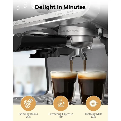 - 20 BAR PROFESSIONAL PUMP: Extract high-quality coffee full of golden oil with the 20-bar high-pressure espresso machine, enhancing the aroma and richness of your espresso. The stainless steel boiler system further intensifies the flavors and richness of your brew.