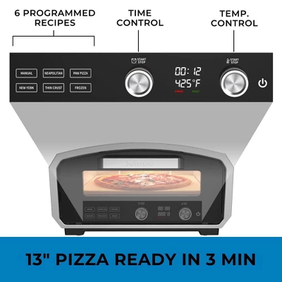 Craft artisanal pizzas like an expert chef in your backyard. Kenmore’s weather-resistant electric pizza oven is rated for indoor or outdoor use and cooks a 13-in pizza in only 3 min. Ultra-high heat cooking up to 850°F gives an authentic stone-baked, wood-fired flavor and texture. Try regional favorites like Neapolitan, Pan/Deep-Dish, New York, and Thin Crust pizzas with built-in presets, or customize your perfect pie with manual controls.
