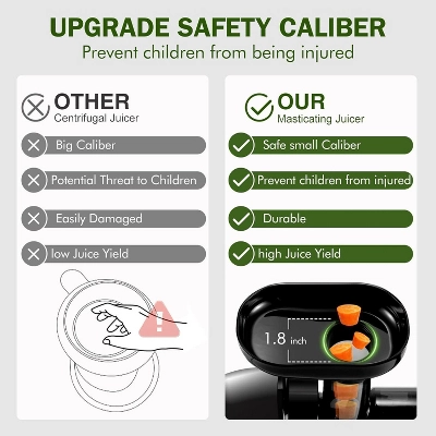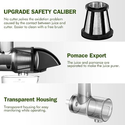 The Slow masticating cold press with a compact feeding chute, capable of removing fruit pits during juicing, reducing bitterness and maintaining the original flavor of the juice. And the small feed chute prevents children’s hands from accidentally entering the feed chute.