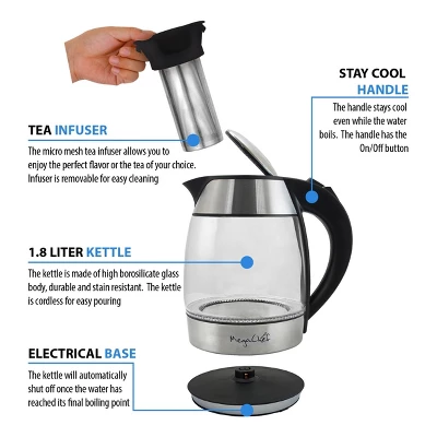 Make all your favorite hot beverages and more with the Mega Chef 1.8Lt. Glass Stainless Steel Electric Tea Kettle. This kettle has a sleek design with a stainless steel finish that looks great in any kitchen. See when the water is boiling with the clear glass construction. Heat up water worry free with the auto shut off feature!