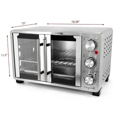 MegaChef 25 Quart French Door Multi-Function Introducing the MegaChef 25 Quart Digital Electric French Door Multi-Function Countertop Oven, a stylish and practical addition to any kitchen. With a generous 25-quart capacity, this oven is perfect for a wide range of cooking tasks, from roasting and baking to toasting and broiling. Operating at 120V and 1500 watts, it provides efficient and consistent heat, while the adjustable temperature control allows you to set it up to 450°F for precise cooking. The 60-minute timer with a bell ring ensures you never overcook your meals, and the four-piece stainless steel heating elements guarantee even and thorough heat distribution. Designed with a sleek, fully stainless steel exterior and an elegant French door design, this oven combines durability with modern aesthetics. The versatile function switch includes settings for broil, bake, and toast, adapting to your culinary needs with ease. An indicator light keeps you informed of the oven’s status, while the included accessories-an aluminum bake tray, wire rack, and crumb tray-enhance your cooking experience and simplify cleanup. Whether you’re a seasoned chef or a home cook, the MegaChef 25 Quart Digital Electric French Door Multi-Function Countertop Oven is the ideal appliance for exceptional cooking results.