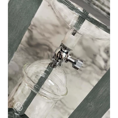 Vintage cold brew coffee maker set in grey color wooden frame. Makes rich coffee and looks great anywhere from your kitchen to your office. Eco-friendly using less plastic than other coffee competitors. Includes thick and sturdy glassware, filters and an adjustable valve to control the process time. The filter and the adjustable valve insure that no coffee grounds get into your final cup of coffee. Easy to assemble, and easy clean after each use. Brief instructions included. Cold brew gives an ultra smooth taste, slightly sweeter, less acidic and not as bitter as a hot cup of coffee. Makes around 6-8 cups of premium cold brew iced coffee. 20in x 8in x 8in