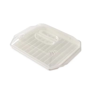 Perfectly cook your bacon, and other small meats, with no messy cleanup. The Compact Bacon Rack is a bacon lover’s dream: the ridges keep grease away from the slices of meat so your bacon will come out crispy and delicious every time. We paired our popular bacon rack with a lid too, to keep spatters contained. The durable high-density plastic bacon rack base is microwave safe (it fits great into smaller microwaves) and oven safe up to 400°F. Handy lid is for microwave use only. With all these convenient features, this rack will become a true time-saver! Proudly made in the USA.
