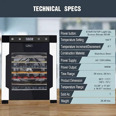 - TEMPERATURE CONTROL: Uses electronic probe & temperature control for food preservation (95-170°F). Dehydrates & preserves meat like the famous beef jerky. Produces organic healthy snacks by dehydrating fruits/vegetables to make potato/kale chips, etc