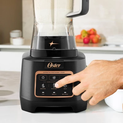 Effortlessly power through ice, frozen fruit, and so much more with the Oster Extreme Mix Blender. Featuring a 2-horsepower turbocharged motor with 1,500 peak watts, this countertop blender does more than create smoothies and frozen drinks—it allows you to whip up chunky salsas, creamy nut butters, and flour from various grains with ease. Oster’s patented 10-blade stack features four titanium-coated blades at four levels throughout the jar to process whole fruits and vegetables in seconds. Intelligent iBlend auto programs blend your favorite recipes at the touch of a button, and the 8-cup premium Tritan jar is BPA free, dishwasher-safe, and scratch- and shatter-proof. Gone are the days of being hands-on with your morning smoothie, stopping your blend to shake ingredients loose, tamping ingredients toward the blade, or dumping everything out to start again. Level up your meal prep while bringing down your time in the kitchen with the Oster Extreme Mix Blender.
