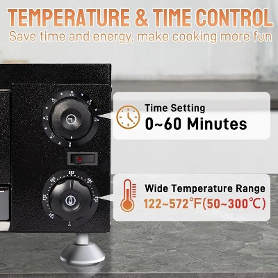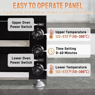 - Precision Temperature & Timer Control: The commercial pizza oven customize your cooking with adjustable temps from 50-300°C (122°F – 572°F) and a built-in timer. Whether you’re slow-baking or searing, this oven gives you full control for pizzas, breads, or snacks—just set it and forget it