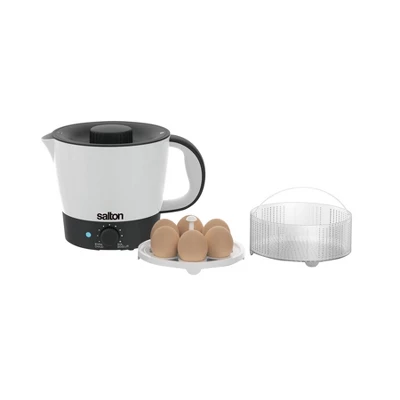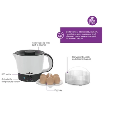 Perfect for quick and easy meals! This Multi-Pot boils water, cooks macaroni & cheese, heats soups, pasta and rice. This one machine is more versatile than your kettle and more convenient than your stove. The Multi-Pot has adjustable temperature for easy cooking and a non-stick inner coating for easy cleaning. Accessories include an egg cooker and a noodle and steamer basket. Perfect for home, office or dorm!