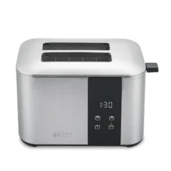 The sleek style of the Salton Digital Long Slot 4 Slice Toaster will enhance any countertop all the while saving space. One size fits all! The long slot design allows you to toast any size waffles, bagels, and artisan breads. The extra wide slots can accommodate both thick and thin slices and the electronic sensor ensures consistent results every time. With variable browning control and a functional countdown timer, this new take on a classic appliance is a kitchen must-have!