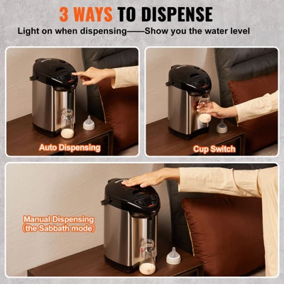 Large Capacity: Our hot water dispenser with 680W high power that rapidly boils water, providing you with hot water whenever needed. Its generous 4L capacity can serve up to 10+ cups of refreshing 300ml drinks. 3-way to dispense: auto-dispensing, cup switch, or manual dispensing. Hot water can also be obtained without power. You can set it to the insulation mode before the Sabbath, allowing you to pump hot water on the Sabbath manually.