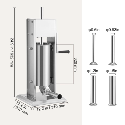 Includes 4 Filling Tubes: This vertical sausage stuffer comes with four stainless steel stuffing tubes (Φ15 mm, Φ21 mm, Φ30 mm, Φ37 mm) and fried dough sticks, meeting different size requirements to make thin Italian fine sausages, flavored salami, or thicker meat sausages.