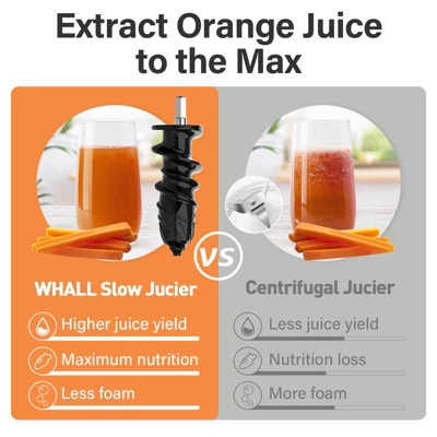 WHALL Cold Press Juicer – Masticating Juicer for Vegetables and Fruits, with Quiet Motor and Reverse Function, Easy to Clean with Included Brush.Start your day without disrupting the household or your peaceful morning routine. The WHALL Cold Press Juicer is equipped with a quiet motor, allowing you to enjoy a calm and noise-free juicing experience.Its convenient reverse function prevents clogging, ensuring smooth, uninterrupted operation. Whether you’re juicing leafy greens, hard vegetables, or soft fruits, this juicer delivers efficient performance with ease.